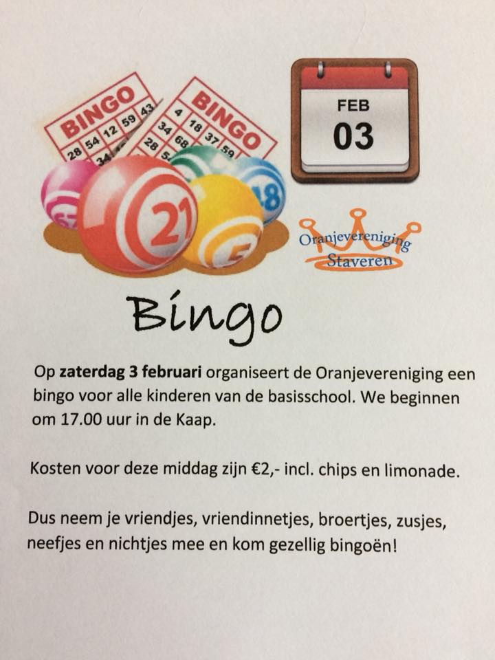 De Oranjevereniging organiseert een Bingo voor alle kinderen van de Basisschool!